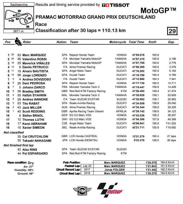 Kad je dobio informaciju da mu se Rossi opasno približava, Marquez je još malo ubrzao i na putu do devete uzastopne pobjede na ovoj kratkoj njemačkoj stazi ipak pobjegao Rossiju, kojem je to drugo mjesto i najbolji rezultat sezone. Vinales je s drugom Yamahom ponovo bio spor na početku utrke potonuo u poretku, da bi u drugoj polovici utrke počeo napredovati, te je u samoj završnici sustigao i prestigao Petruccija, na putu do trećeg mjesta. Jorge Lorenzo je do kraja utrke potonuo na šesto mjesto, iza Petruccija i odlično raspoloženog Bautiste na godinu dana starom Ducatiju, ali i taman ispred timskog kolege Doviziosa. Poredak prve desetorice zaključili su Pedrosa na Hondi, Zarco na Yamahi i Smith na KTM-u.