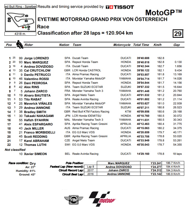 Uglavnom, nakon što su se izmjenjivali u vodstvu, Lorenzo je posljednji krug odvozio na samoj granici, ne dopustivši Marquezu da ga uopće napadne u posljednja dva zavoja. Tako je Lorenzo došao do svoje treće pobjede s Ducatijem, s samo 13 stotinki prednosti u odnosu na Marqueza, dok je trećeplasirani Dovizioso zaostao 1,6 sekundi. Njih trojica su bili klasa za sebe, pa je tako četvrti Crutchlow bio u minusu od 9 sekundi za pobjednikom, dok je petoplasirani Petrucci kasnio više od 13 sekundi. Umalo ga je sustigao i Rossi koji je krenuo s tek 14 startne pozicije, ali se probio do 6. mjesta, dok su poredak prve desetorice popunili Pedrosa, Rins, Zarco i Bautista.