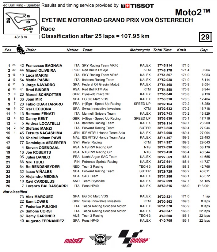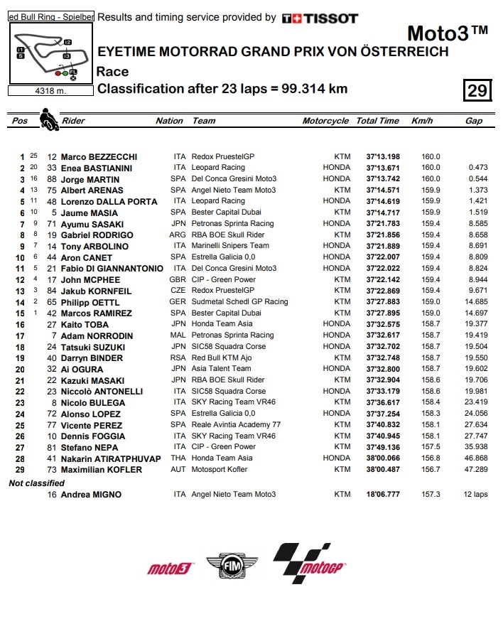 U klasi Moto3 se Bezzecchi odlično nosio s pritiskom te je u neizvjesnoj utrci donio pobjedu KTM-u na njihovom domaćem teritoriju. No, junak dana je svejedno bio Jorge Martin, koji je prije samo tjedan dana slomio lijevu ruku i obavio operaciju, a svejedno je cijelu utrku pritiskao Bezzecchia. Na kraju se između njih dvojice progurao Bastianini, no Jorge Martin je ipak osvojio bodove za treće mjesto, sa samo pola sekunde zaostatka za pobjednikom, te je tako ostao sasvim u kontaktu s Bezzecchijem u borbi za naslov prvaka.