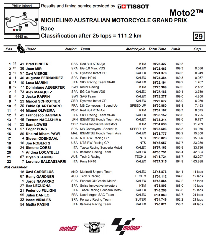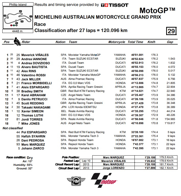 Osim toga, treba reći i da sama staza u Phillip Islandu, sa svojim tekućim i brzim zavojima, odgovara genetskom kodu stabilne Yamahe, koja je najbrža kad može dugo vremena provesti u dubokom nagibu. A sve treba promatrati i u kontekstu toga da se stari/novi svjetski prvak Marquez nije stigao uključiti u borbu za pobjedu. U rep njegove Honde je, na kraju ciljne ravnine, udario Zarco, koji je pritom i brutalno pao, srećom bez ikakvih posljedica. Marquez je uspio ostati na dva kotača, ali je morao odustati zbog slomljenog sjedala.
