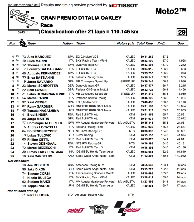 U klasi Moto2 je Alex Marquez odvozio odličnu utrku, uspio se odvojiti naprijed te je samo naizgled lako došao do druge uzastopne pobjede. Čast domaćina obranio je Marini, koji je ciljem prošao drugi, malo ispred Luthija, dok je ukupno vodeći Baldassarri završio kao četvrti. Zahvaljujući tome se sve dodatno zgusnulo na vrhu, pa su tako Baldassarri, Marquez i Luthi unutar samo 4 boda.