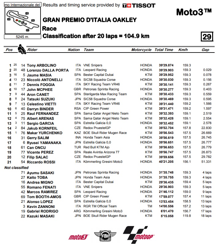 U očekivano frenetičnoj Moto3 utrci je došlo do preokreta u doslovno posljednjim metrima. Dotad je Dalla Porta bio u blagoj prednosti pri ispucavanju na startno ciljnu ravnicu, ali taj posljednji put je Tony Arbolino bio bolji od njega, uhvatio zavjetrinu i prošao ga u posljednji tren. Arbolino je do svoj prve pobjede došao s prednošću od samo 29 tisućinki sekunde, a iza dvije Honde ciljem je prošao Masia na KTM-u, sa zaostatkom od tek 78 tisućinki. Osam vozača je prošlo ciljem unutar samo 6 desetinki, a među njima je bio i sedmi Canet, koji je tako zadržao vodstvo u ukupnom poretku, ali sad ima samo 3 boda više od Dalla Porte.