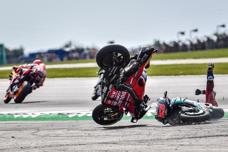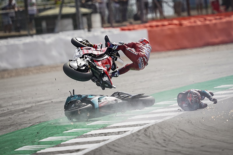 Quartararo se vinuo u zrak, a Petronas Yamaha se bacila na bok i prepriječila Doviziosu. Vozač Ducatija nije imao kamo… Srećom, obojica vozača su se izvukla bez težih posljedica, s laganim potresom mozga i brojnim masnicama. U cijeloj je priči najgore prošao Desmosedici GP19, koji se na kraju i zapalio.