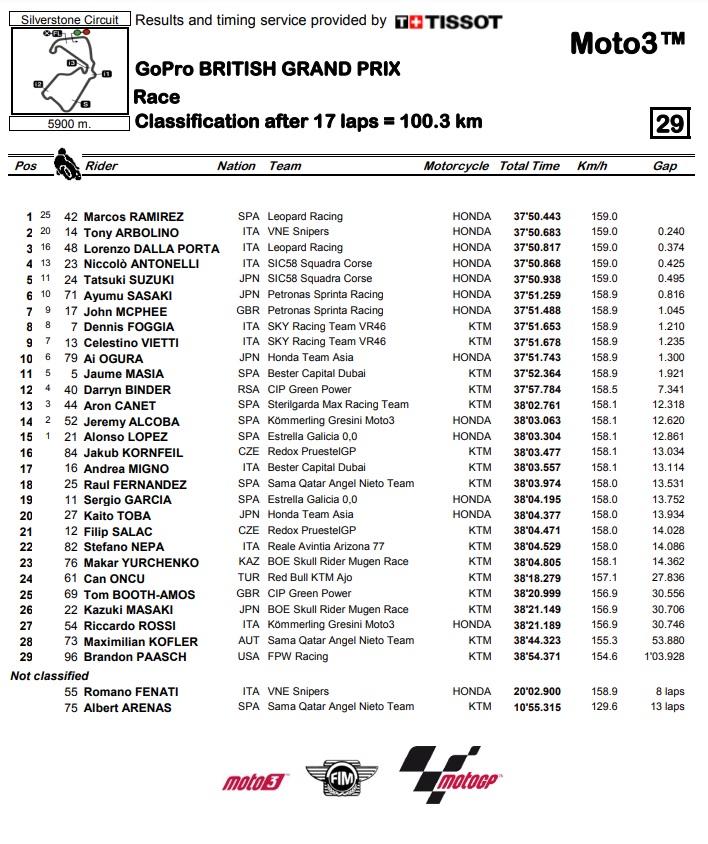 U uobičajeno uzbudljivoj Moto3 utrci je prvih 11 vozača prošlo ciljem unutar 2 sekunde. Među njima je najsretniji bio Ramirez, koji je pobijedio ispred Arbolina, Dalla Porte, Antonellija… Prvih 7 vozača je bilo na motociklima Honde, dok je Canet, kao ovogodišnja glavna uzdanica KTM-a, pao u ranoj fazi utrke, ali se odmah i vratio te dao u potjeru koja je na kraju rezultirala osvajanjem 13. mjesta. To znači da je osvojio 3 boda s kojima zaostaje 14 bodova za Dalla Portom, s time da bi se u borbu za naslov još mogao uključiti i Arbolino.