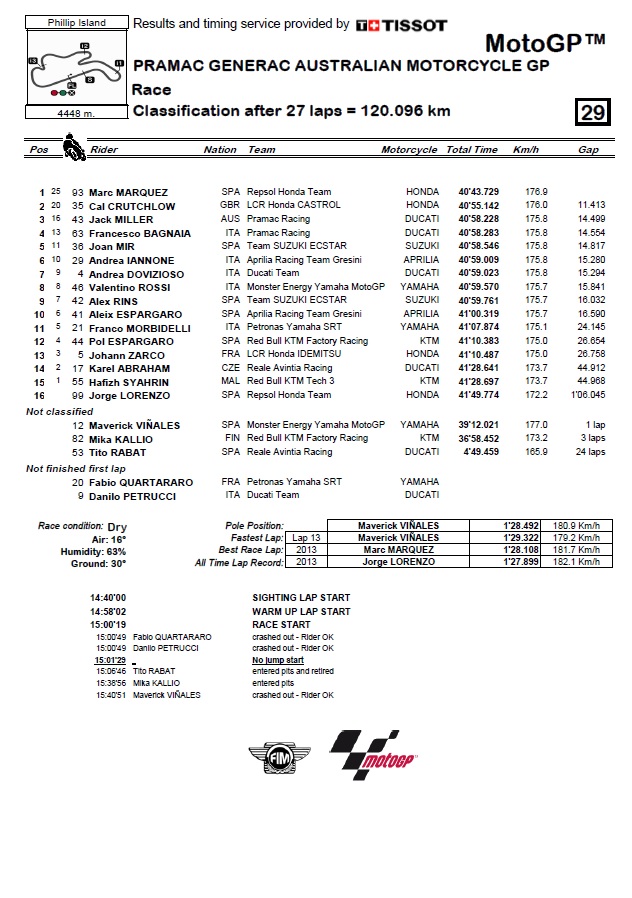 Od požrtvovnog ali nesretnog Vinalesa drugo mjesto je naslijedio Crutchlow, dok je na veselje australske publike kao treći ciljem prošao Miller na Pramac Ducatiju i to nakon neizvjesne borbe do posljednjeg metra. Unutar dvije sekunde za Millerom ciljem su redom prošli Bagnia, Mir, Iannone, Dovizioso, Rossi, Rins i Aleix Espargaro, koji je kompletirao prvu desetoricu. Bili su to najbolji rezultati u dosadašnjem dijelu MotoGP karijere za rookie vozače Bagnaiu i Mira, ali i najbolji rezultat Iannonea otkad je u Apriliji.
