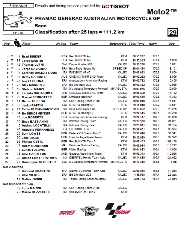I dok je Marc Marquez kako sezona odmiče sve uvjerljiviji, njegov brat Alex Marquez kao da se preplašio osvajanja Moto2 titule. Iako je u Tajlandu bio 5., a u Motegiju tek 6., svejedno je u Phillip Islandu imao prvu meč loptu, no trebao je pobijediti, a on je umjesto toga završio tek na 8. mjestu. Baš kao i prije godinu dana na istoj stazi, pobijedio je Brad Binder s KTM-om, kojeg je skoro cijelu utrku pritiskao timski kolega i prošlogodišnji Moto3 prvak Jorge Martin. Treće mjesto je ugrabio Tom Luthi, koji je tako svoj zaostatak za Marquezom smanjio na 28 bodova, dok Binder kasni 33 boda.