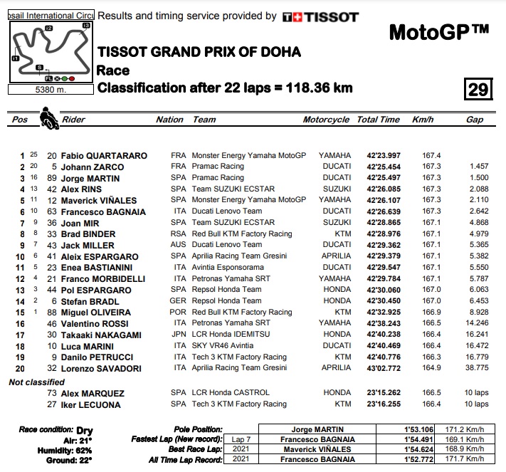 Suzuki nikako da dođe do podija u Kataru, pa je tako Rins prošao ciljem četvrti, samo 22 stotinke prije prošlotjednog pobjednika Vinalesa. Treba spomenuti i žestoki obračun između Mira i Millera, u kojem se Španjolac prvo na silu provukao ispred Australca, a onda ga je Miller namjerno zakačio na izlasku iz zadnjeg zavoja, pri čemu su obojica izgubili nekoliko pozicija. Nakon najlošijih kvalifikacija u karijeri, Rossi je bio mrvicu konkurentniji u samoj utrci, ali 14 sekundi zaostatka za pobjednikom je te nedjelje bilo dostatno tek za 16. mjesto.