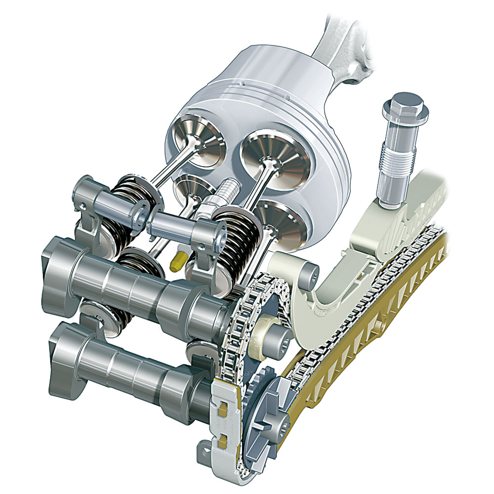 To znači da su u glavama su i dalje četiri radijalno postavljena ventila, ali sada njima umjesto samo jedne upravljaju dvije lancem pokretane bregaste osovine, s time da svaka od njih zbog svog horizontalnog smještaja dirigira radom po jednog usisnog i jednog ispušnog ventila.