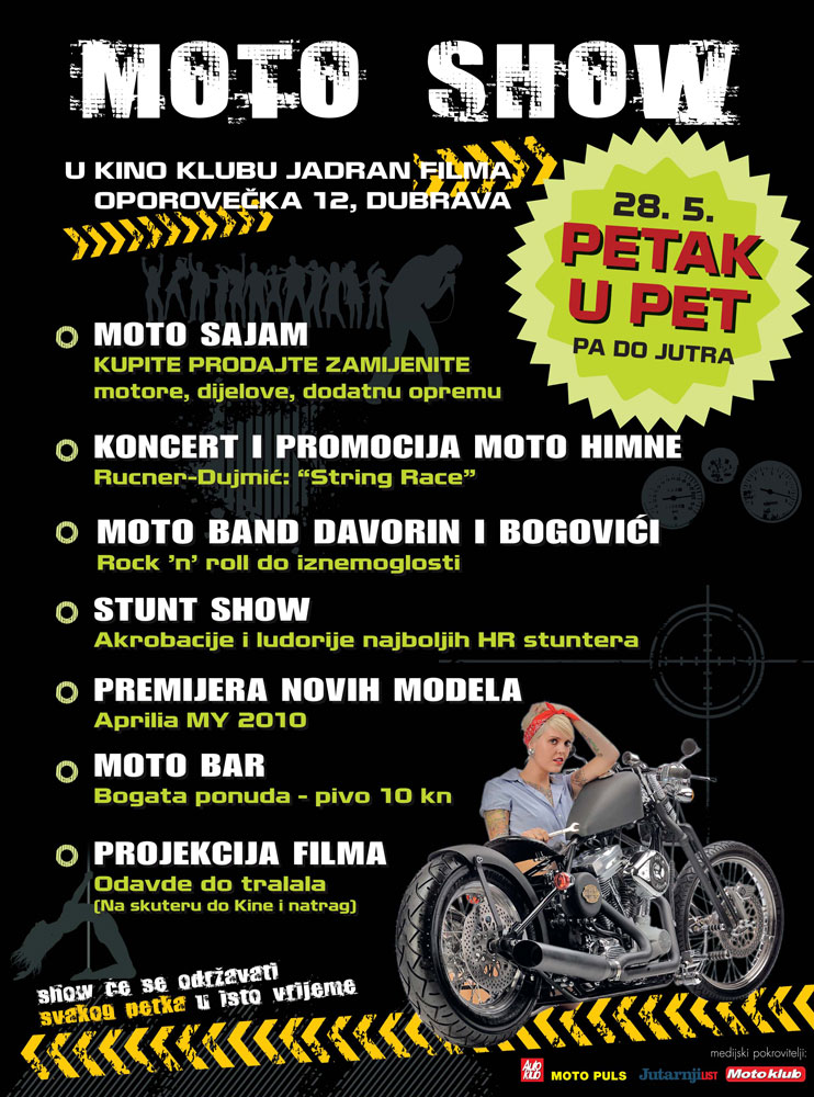 Moto event sasvim novog karaktera održat će se poslijednji vikend mjeseca svibnja, točnije u petak 28.05.2010. Rečenog petka u kino klubu Jadran Filma za glazbenu kulisu pobrinut će se rock band Davorin i Bogovići, a premijerno će biti predstavljena...