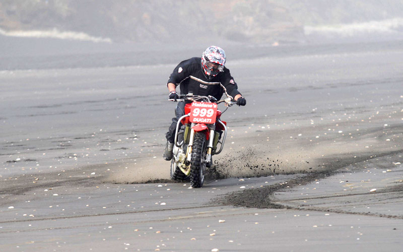 Dok je kod nas na plažama sunčano, na Novom Zelandu je tmurno, zimsko, hladno i maglovito vrijeme. Vlažni tvrdi pjesak se pokazao kao odlična podloga za Stevea Haldanea kako bi iskušao što može njegov terenski Ducati. Ne, nije riječ o izvedenici iz Multistrade već je ovaj motocikl život započeo kao Ducati 999, a Steve ga je „doradio" kako bi mogao juriti pješčanim plažama.