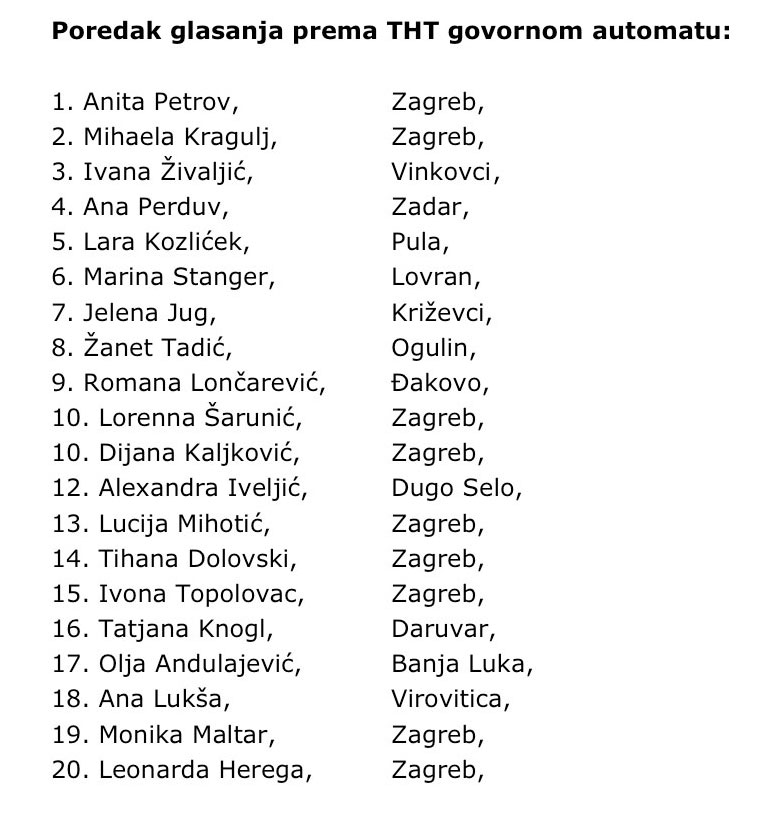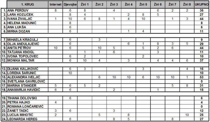 Kako je i uobičajeno za izbore ljepote, 24 kandidatkinje su se publici i žiriju predstavljale u nekoliko izlazaka, podjeljene u četiri grupe, a prvi izlazak na pozornicu je bio u seksi izdanju. Nakon ovog kruga članovi žirija su trebali prepoznati svoje favoritkinje te im dodjeliti glasove, a iz bodovnih lista vidimo da je odmah povela mlada Alexandra Iveljić dok su se na drugom mjestu pojavile Ivana Živeljić i Anita Petrov.