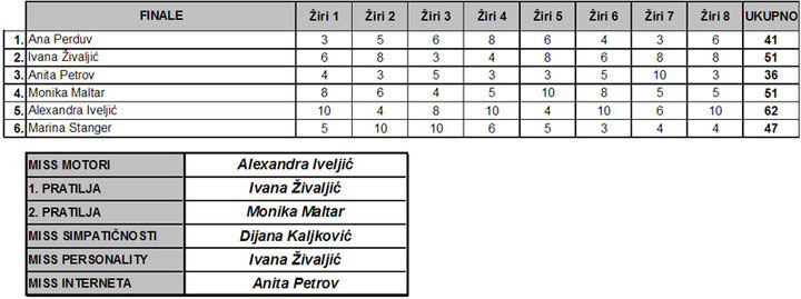 U napetoj završnici su se na pozornici uz tri skutera Derbi Boulevard 50, koje poklanja generalni sponzor izbora tvrtka Ami Trade d.o.o. našle samo finalistice i voditelji. Oni koji su glasali putem Interneta najviše svojih glasova su dali zanosnoj Aniti Petrov koja se kao i druge djevojek koje su zaslužile titule okitila brojnim i vrijednim nagradama naših sponzora među kojima i računalom tvrtke Autronic d.o.o. Za Miss Personality je proglašena Ivana Živaljić koja je svojom ljepotom i skromnošću očito osvojila i žiri jer je nekoliko minuta kasnije dobila i lentu prve pratilje Miss Motori 2010. Uvijek nasmijana, titulu Miss Simpatičnosti je zasluženo osvojila Dijana Kljaković dok je druga pratilja Miss Motori 2010. Monika Maltar. Na pozornici su tada ostale samo još Marina Stranger, Ana Perduv i Alexandra Iveljić, a samo jedna od njih je mogla dobiti titulu Miss Motori 2010. Dok su se preostale dvije kandidatkinje morale zadovoljiti ulaskom u finale, lentu pobjednice ovog izbora te skuter Derbi Boulevard 50 i brojne druge nagrade je s najvećim brojem glasova osvojila Alexandra Iveljić.