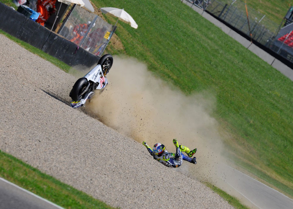 U brzoj šikani, kakvima Mugello obiluje, Rossiju je 15 minuta prije kraja subotnjeg slobodnog treninga popustila stražnja guma, nakon čega je bio katapultiran s motocikla. Rezultat teškog pada je otvoreni prijelom noge, a jedina dobra vijest je da pritom nije došlo do oštećenja glavnih krvnih žila. Iako je prerano donositi prognoze, lako je moguće da će se vrijeme potrebno za oporavak brojiti u mjesecima.