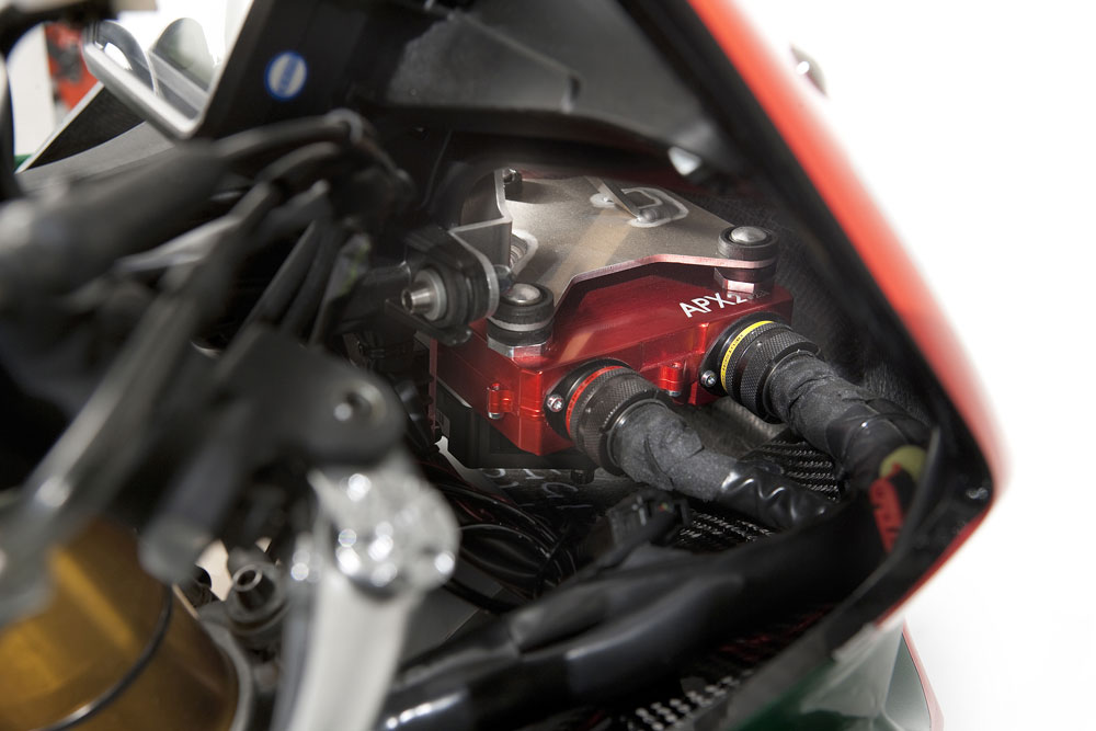 Gotovo da ne treba niti govoriti da je cijeli motocikl obučen u oklope od ugljičnih vlakana koji za ovu priliku nose boje Alitalije, talijanskog zrakoplovnog prijevoznika, dok agregat štite poklopci od ugljičnih i kevlarskih vlakana.