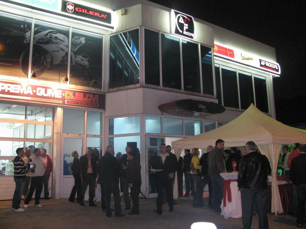 Na otvorenju su u novom prostranom salonu uz atraktivne hostese i zabavan program upoznali uzvanike sa širokom paletom vozila Piaggio Grupacije, a detaljnije su bili predstavljeni noviteti za 2010. poput Aprilije Scarabeo 200 i.e, Aprilije Dorsoduro 750 Factory te Aprilije RSV4 R.