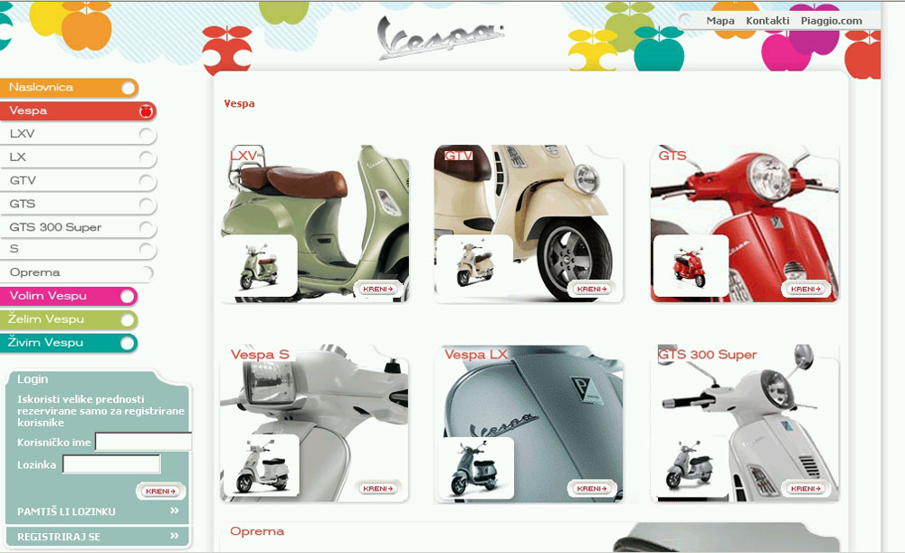 Na novoj Vespinoj stranici preko jednostavnog sučelja možete se upoznati s trenutnom ponudom Vespi, dodatnom opremom, akcijama, tehničkim podacima te slavnom poviješću modela. Također, još važnije od toga, možete na kratko osjetiti pozitivan duh, stilsku profinjenost i romantiku kojom je oduvijek zračila Vespa.