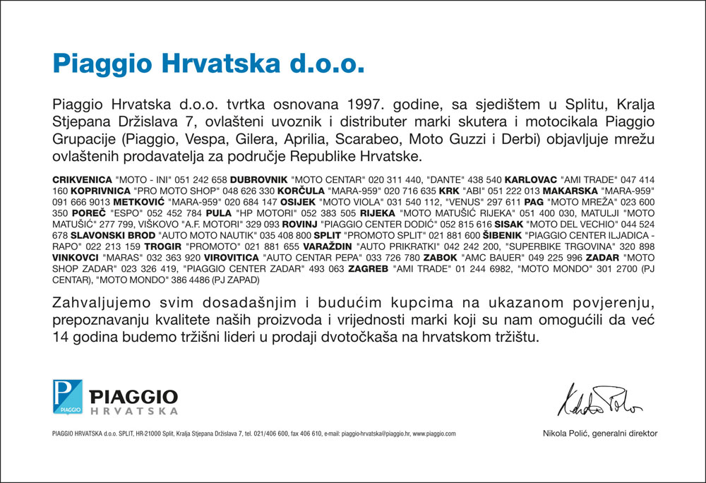 Piaggio Hrvatska d.o.o. ovlašteni uvoznik i distributer marki skutera i motocikala Piaggio Grupacije (Piaggio, Vespa, Gilera, Aprilia, Scarabeo, Moto Guzzi i Derbi) objavio je...