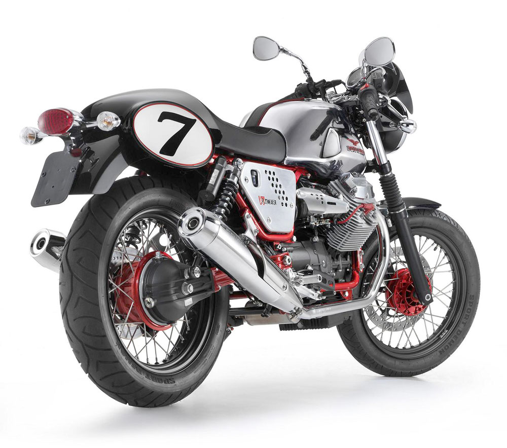 Prva stvar koju ćete primijetiti je kromirani spremnik goriva ukrašen elegantnim kožnim remenom. To je očita poveznica s motociklima iz prošlosti, kao i metalni Moto Guzzi logotip koji je bojom usklađen s okvirom motocikla. Crveni okvir, inspiriran prvom serijom V7 Sport motocikala, specijalno je obrađen, kao i glavčine kotača i stražnja vilica, kako bi dobio poseban sjaj i naglasio estetsku privlačnost strukture dvostrukog okvira. Na vrhu okvira smješteno je i sjedalo za jednu osobu presvučeno u brušenu kožu (sjedalo za dvije osobe i oslonci za noge suvozača dostupni su kao dodatna oprema). Sjedalo završava s aerodinamičnim oklopom na repu motocikla koji na sebi ima bočno postavljene trkaće brojeve u pravom stilu 70-tih.