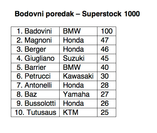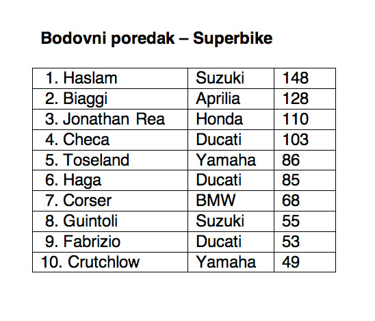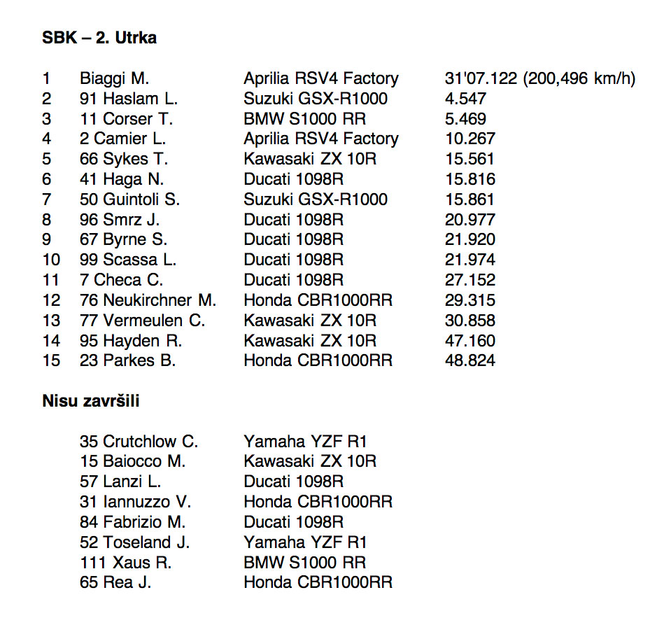 Drugo mjesto je tako pripalo Leonu Haslamu, koji je zadržao vodstvo u ukupnom poretku, dok je treći bio Troy Corser, koji je u Monzi prvi put doveo BMW na pobjedničko postolje otkako se njemački proizvođač priključio prvenstvu početkom prošle godine.