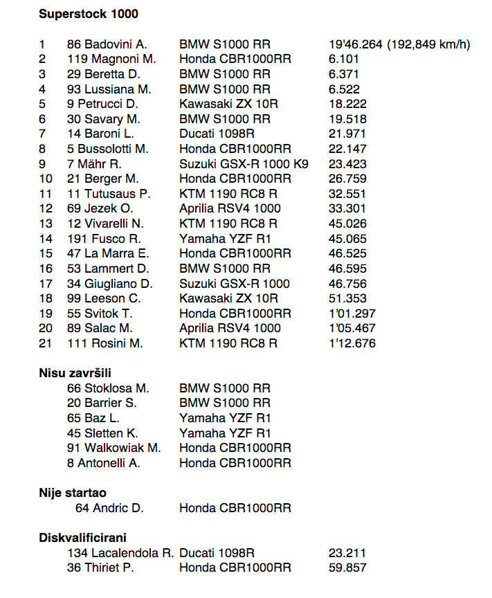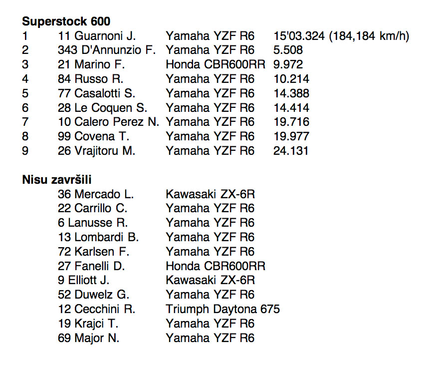 U klasi Supersport Eugene Laverty ostvario je dominantnu pobjedu ispred Kenana Sofuoglua i Joana Lascorza. U Superstocku 1000 opet je, četvrti put u isto toliko utrka, slavio Ayrton Badovini na BMW-u S 1000 RR-u, dok je utrka klase Superstock 600 bila obilježena odustajanjima. Završilo je samo devet vozača, a pobjeda je pripala Jeremyju Guarnoniju.