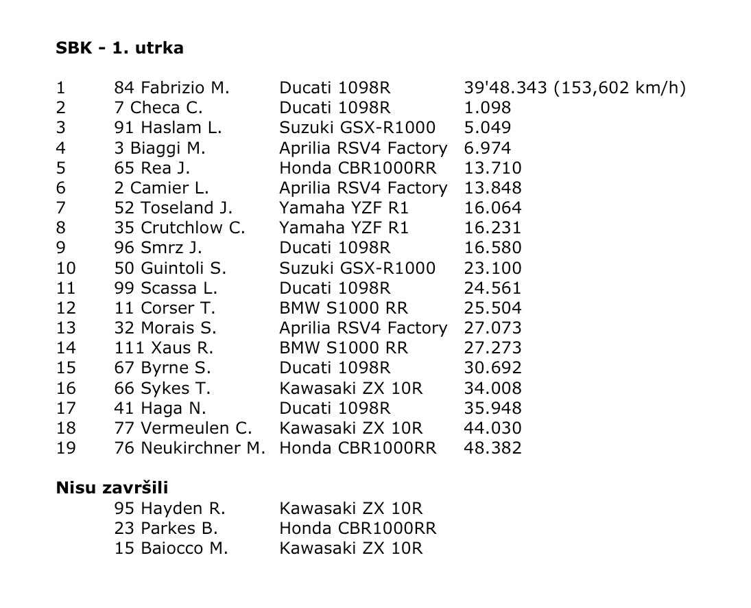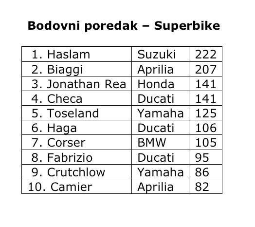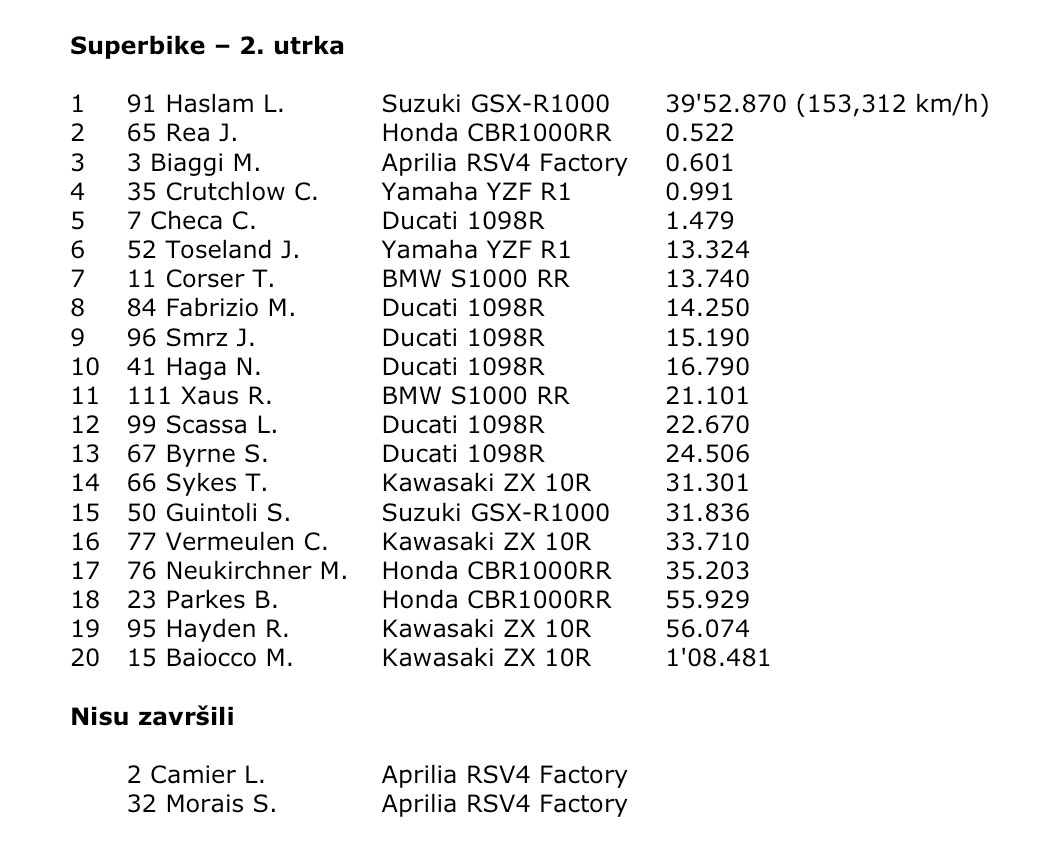 U drugoj utrci situacija je bila bitno drukčija, pobjeda je pripala Leonu Haslamu, na drugom mjestu je završio Jonathan Rea na Hondi, dok je na posljednju stepenicu pobjedničkog postolja stao Max Biaggi na Apriliji. U ukupnom poretku Haslam je povećao bodovnu prednost na 15 bodova ispred Biaggija te se čini da njih dvojica ove godine imaju najviše izgleda za osvajanjem naslova prvaka.