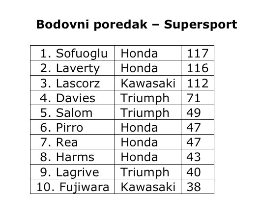 U klasi Supersport treći put zaredom slavio je Eugene Laverty, ispred Kenana Sofuoglua i Chaza Daviesa. Dosadašnji vodeći čovjek prvenstva, Joan Lascorz, završio je tek na petom mjestu i time je vodstvo u ukupnom poretku prepustio Sofuogluu.