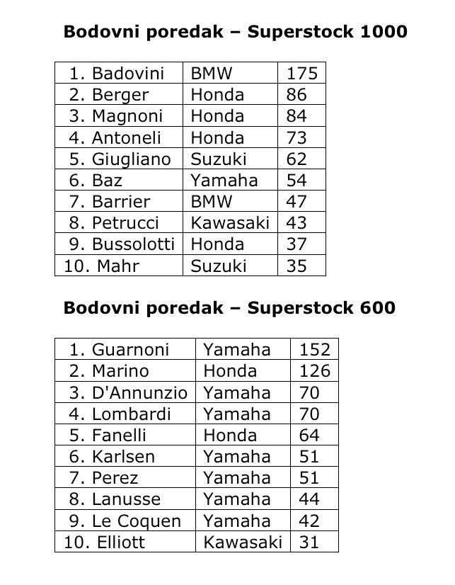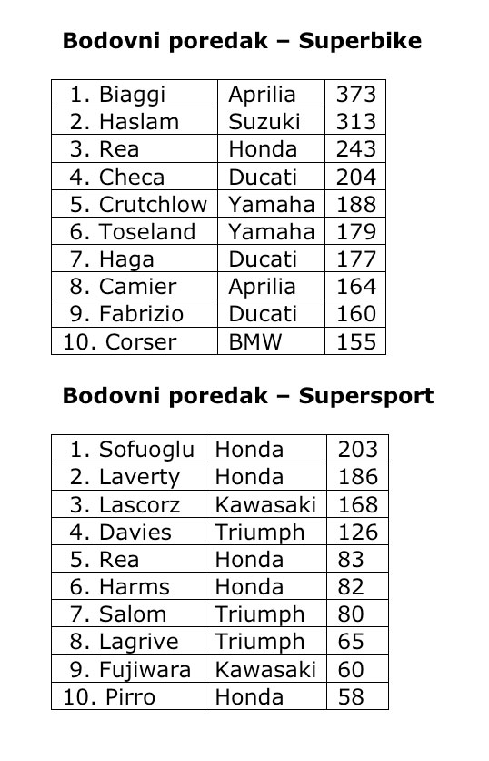 Superbike / Supersport - bodovni poredak