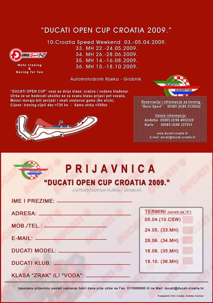 Ducati klub Croatia poziva sve vlasnike Ducatija na "Ducati open cup Croatia 2009" koji će se ove godine održati u sklopu Motohappeninga na Grobniku. Utrka će se voziti u dvije klase, vodeno i zračno hlađenje. Svaka će se utrka bodovati samo pod uvijetom da u svakoj klasi bude prijavljeno minimalno pet natjecatelja. Sve informacije na www.ducati-croatia.hr