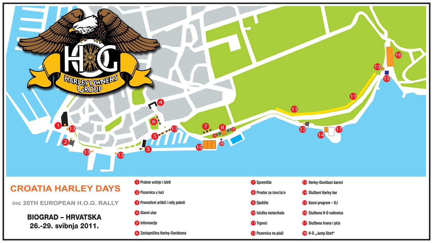 Ulaz na događanje je besplatan za sve, a zabavni program uključuje vrhunske DJ-eve, glazbu u život koja će kulminirati nastupom Prljavog Kazališta te brojne druge zabavne sadržaje. Naravno, biti će tu i prodajnih sadržaja, mimohod Harley-Davidson motocikala od Zadra do Biograda te još štošta što će 20. europski H.O.G. rally učiniti vrijednim pamćenja.
