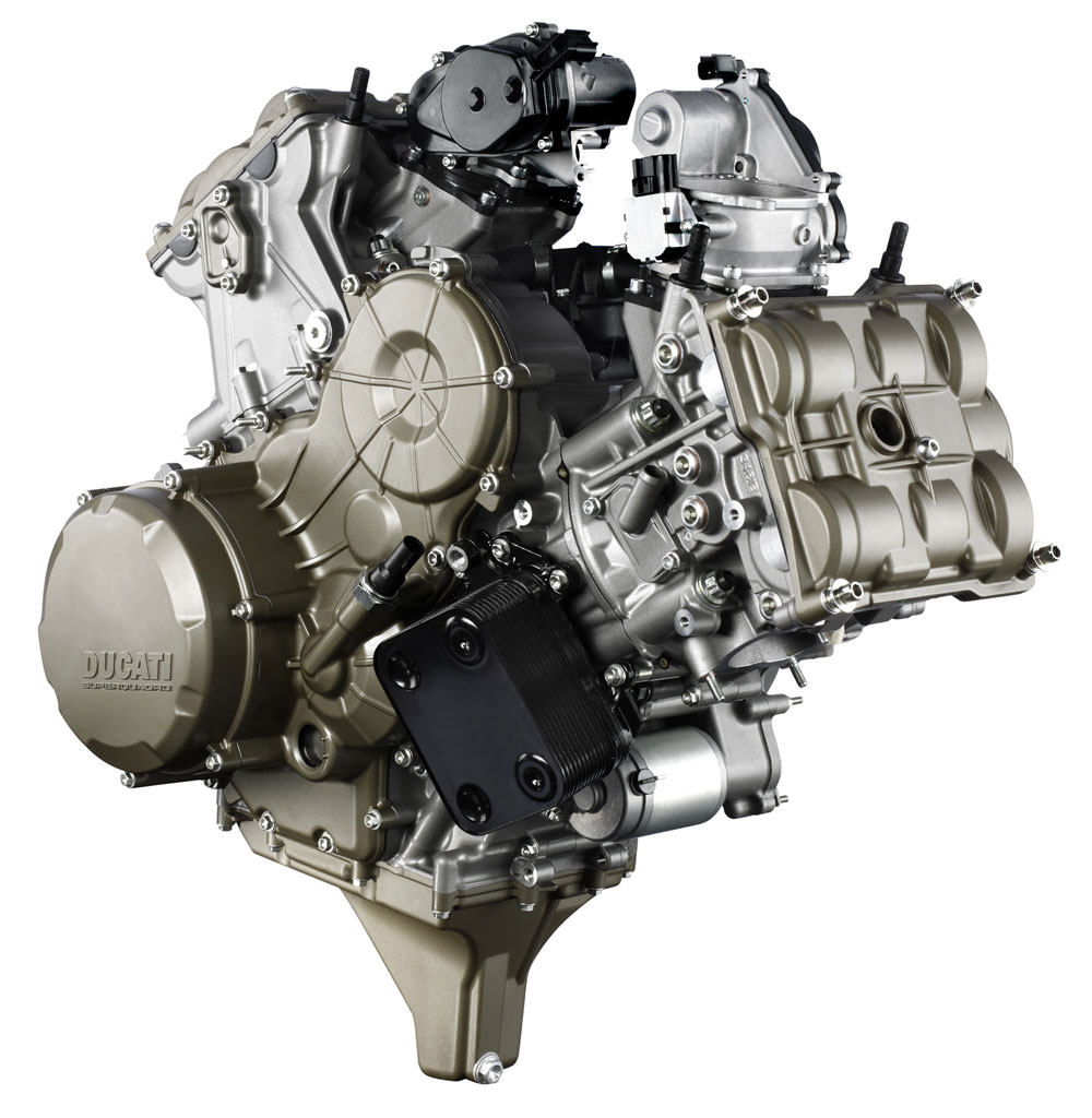 U želji da postignu optimalnu konfiguraciju, inženjeri Ducatija su se odlučili za ekstremne mjere što znači da provrt cilindra iznosi čak 112 milimetara, a hod klipa tek 60,8 milimetara. Proučavajući osobine ovakvog agregata odlučeno je da će imati snagu i zakretni moment koje smo naveli. Ovako veliki provrt omogućuje povećanje broja okretaja pošto za istu zapreminu razultira iznimno kratkim hodom, a tu je i prednost veće površine klipa, što omogućuje ugradnju vrlo velikih ventila. Usisni ventili su narasli s 43,5 na 46,8 mm, a ispušni sa 34,5 na 38,2 milimetra. Veliki promjer klipa donio je i izazove, ali tome su u Ducatiju doskočili korištenjem napredne tehnologije koja omogućuje smanjenje bočne površine klipa, a bez ugorožavnaja pouzdanosti na visokim okretajima.