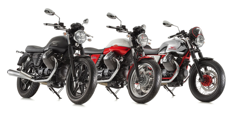 Aktualnu trojku čine modeli V7, V7 Special te V7 Racer, s tim da su sve izvedbe sposobnije i ekološki prihvatljivije zahvaljujući evoluciji prepoznatljivog Moto Guzzi V2 uzdužno postavljenog agregata. Ovaj dvocilindraš iz Mandela sada diše kroz novo kućište filtra zraka, a novosti uključuju i sustav elektronskog ubrizgavanja s jednim leptirastim tijelom promjera promjera 38 milimetara koje potpisuje Magneti Marelli. Dvije lambda sonde u ispušnom sustavu pomažu optimizaciji rada agregata, a izmjene na cilindrima odnosno njihovom orebrenju donosi niže radne temperature.