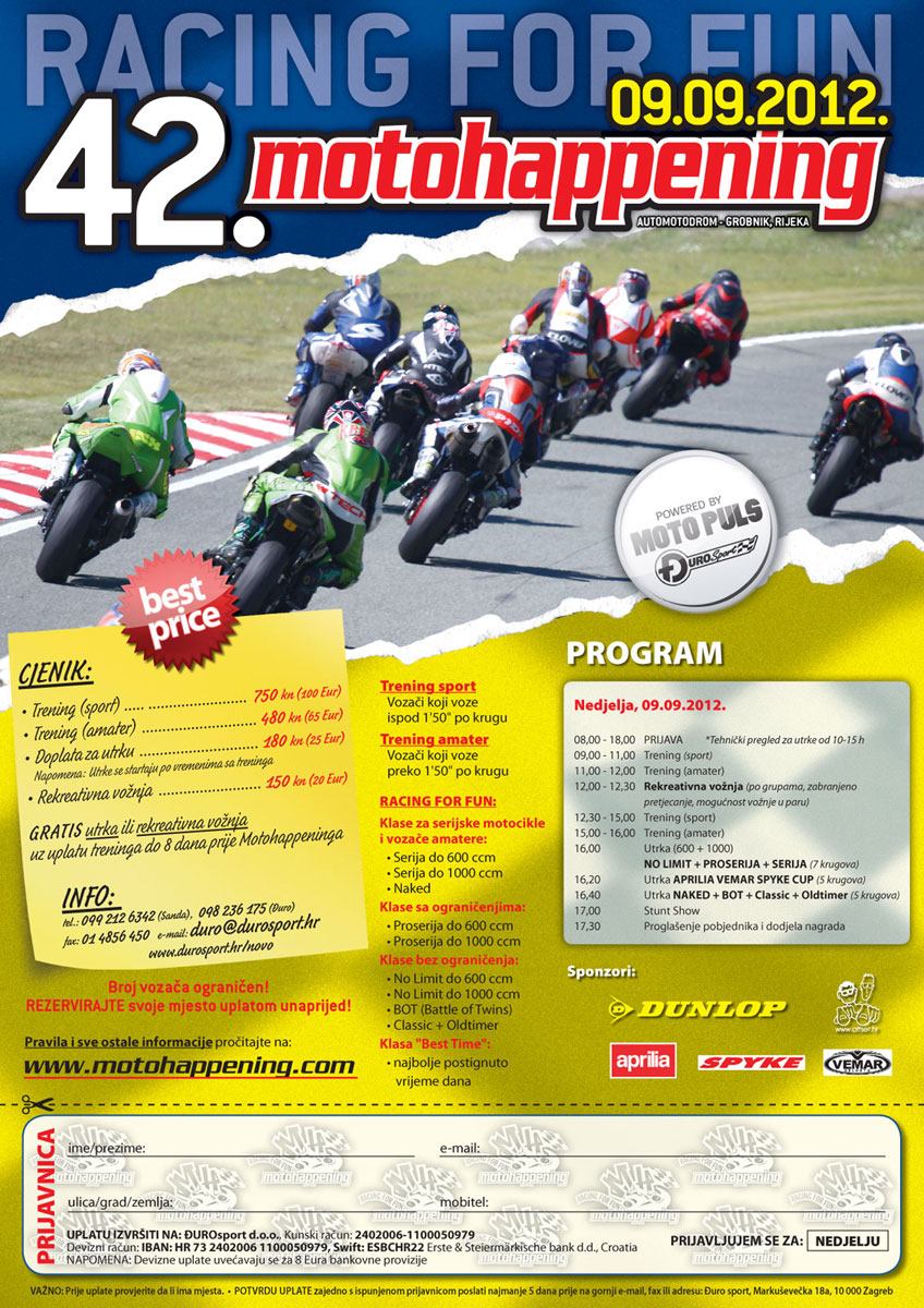 09. rujna održat će se 42. Motohappening na Grobniku koji će ovog puta biti samo jedan dan i to u nedjelju. Raspored je i ovog puta prilagođavan kako bi zadovoljio večinu.