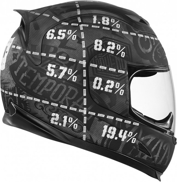 Bila bi to još jedna integralna kaciga, konkretnije još jedna trokompozitna kaciga iz serije Airframe marke Icon, da verzija Statistic nije posebna po neobičnom grafičkom rješenju. Podijeljena na polja ispisana postocima, ona vam govori kolike su šanse da prilikom pada udarite baš tim dijelom kacige.