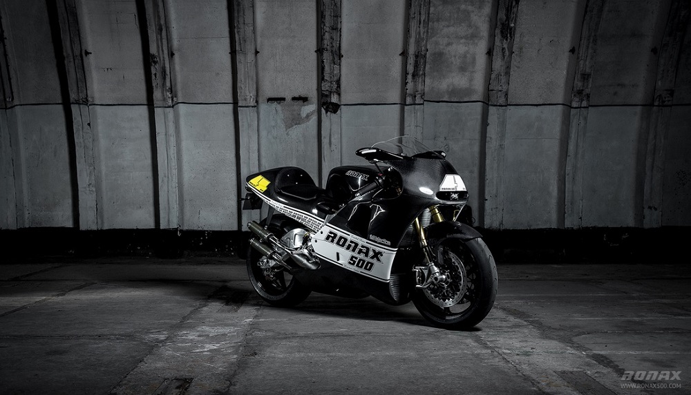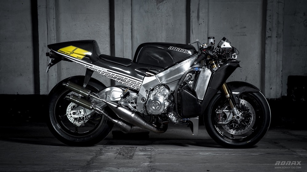 No, sličnost s posljednjim dvotaktnim Grand Prix motociklima nije samo površna. Ronax 500 ispod svojih karbonskih oplata djeluje kao pravi Grand Prix motocikl od prije malo više od desetljeća, a tome u prilog ide i sam dvotaktni V4 agregat s provrtom od 54,5 i hodom od 54 mm, kutom od 80° između dva reda cilindara te dva koljenasta vratila. Uz pomoć modernog elektronskog ubrizgavanja goriva iz 499 ccm je izvučeno 160 KS pri 11.500 okr/min, a uz osnovnu mapu na raspolaganju je i ona prigušena za kišu.