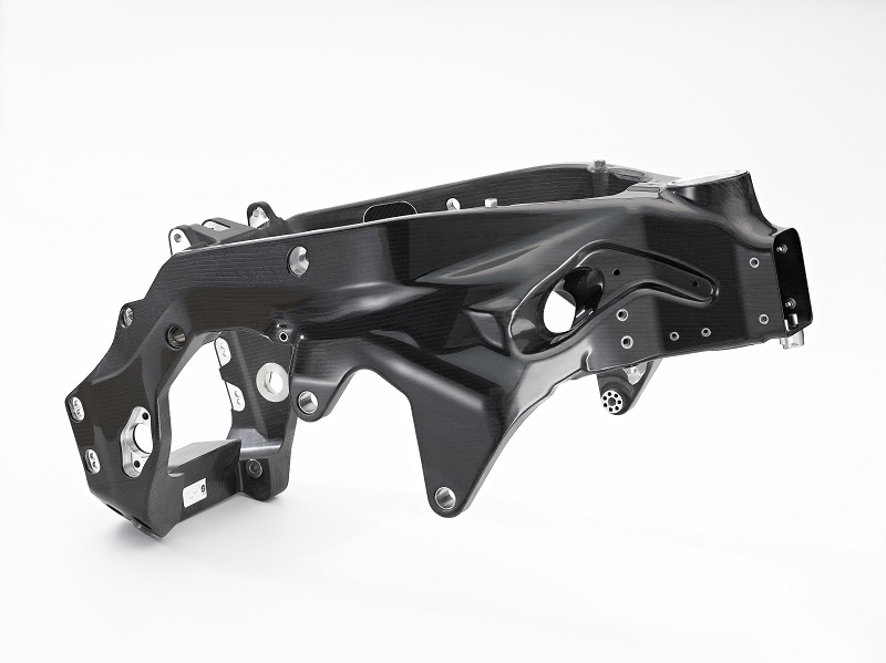 No, glavnu razliku od svega dosad viđenog predstavlja karbonski okvir, koji teži samo 7,8 kg te je kao takav za otprilike trećinu lakši od standardnog aluminijskog okvira. I karbonski kotači su za 30% lakši od kovanih aluminijskih, a i nosač stražnjeg kraja je izveden u obliku samonosive karbonske konstrukcije te nudi mogućnost podešavanja u tri visine. Od karbona su i oplate, blatobran i mnoštvo drugih elemenata, ali ne i stražnja vilica, koja je natjecateljske izvedbe, no izrađena od aluminija.